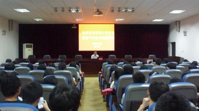 2015年6月29日晚7:30于二办301,数学与统计学院邀请湖南省统计局局长张世平同志进行统计学专题讲座。参加此次讲座的有数学与统计学院党总支书记鄢茵副教授、数学与统计学院院长谢小良教授、统计系系主任李梦觉教授、数学与应用数学系系主任万前红博士、信息与计算科学系系主任姚落根博士、统计系蔡宏宇副教授以及数学与统计学院全体大一新生。本次讲座由谢小良教授主持。